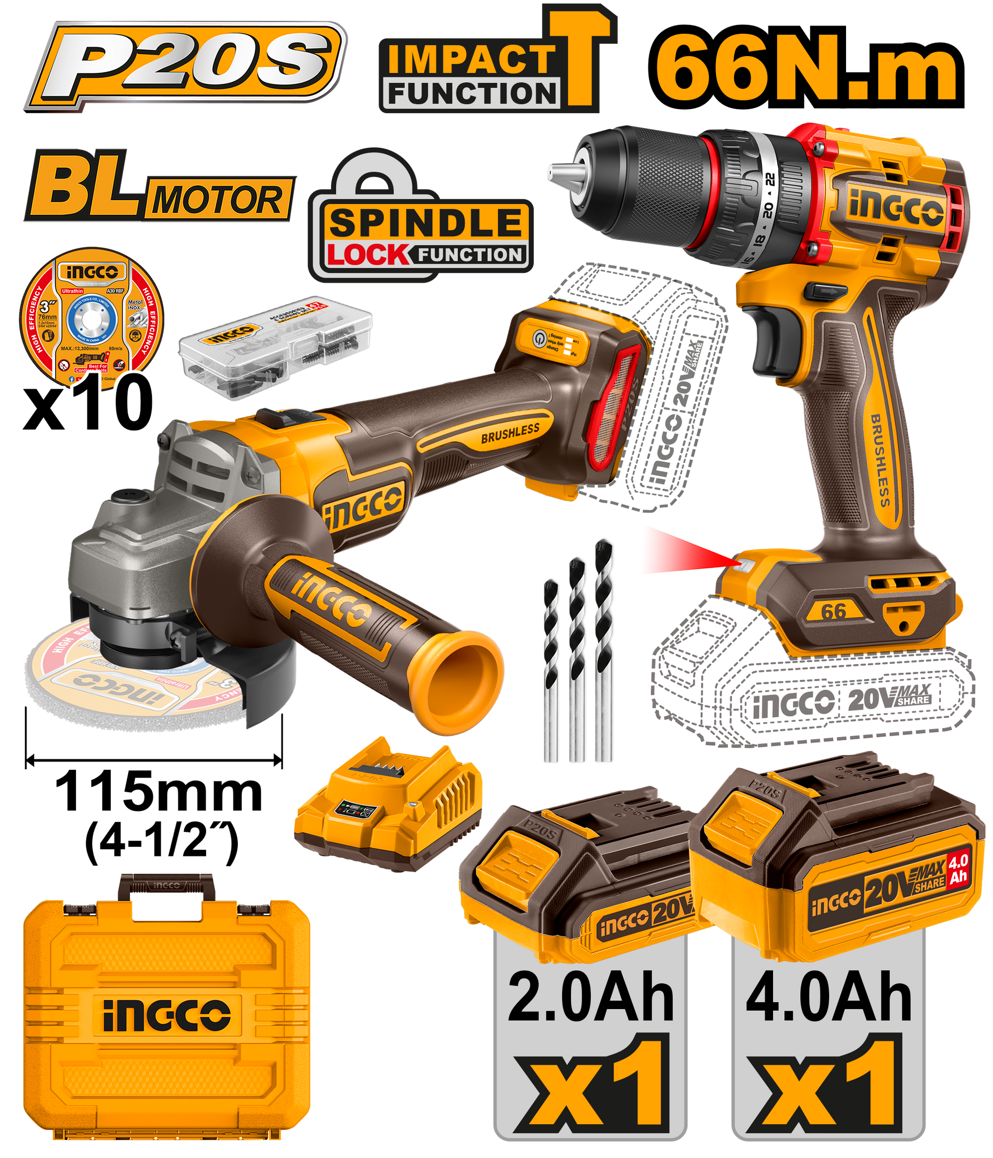 Voltage: 20V Includes: 1 Piece cordless angle grinder (CAGLI21154) 1 Piece compact Brushless Cordless Impact Drill (CIDLI206681) Cordless angle grinder (CAGLI21154): Brushless Motor No-load speed:3 000/6 000/9 000 rpm Disc diameter: 115 mm Spindle thread: M14 Compact Brushless Cordless Impact Drill (CIDLI206681): Brushless motor No-load speed: 0 - 500/0 - 2 000 rpm Max impact rate: 30 000 bpm Max torque: 66Nm Metal chuck Chuck capacity: 13 mm Torque settings: 22 + 1 + 1 Mechanical 2-speed gear Spindle lock function Integrated LED work light Includes: 1 Set 115 mm abrasive metal cutting disc (10 Piece) 47 Piece accessories 1 Piece 2.0Ah battery pack (FBLI20011) 1 Piece 4.0Ah battery pack (FBLI20021) 1 Piece P20S Lithium-Ion battery charger (FCLI2001) Charge volts: 220 - 240V ~ 50/60Hz Packed by carrying case.
