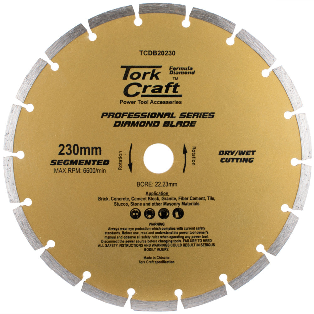 Professional Series Diamond Blade with Segmented Rim for building materials. Standard 22.23mm bore size to fit all makes of handheld angle grinders.