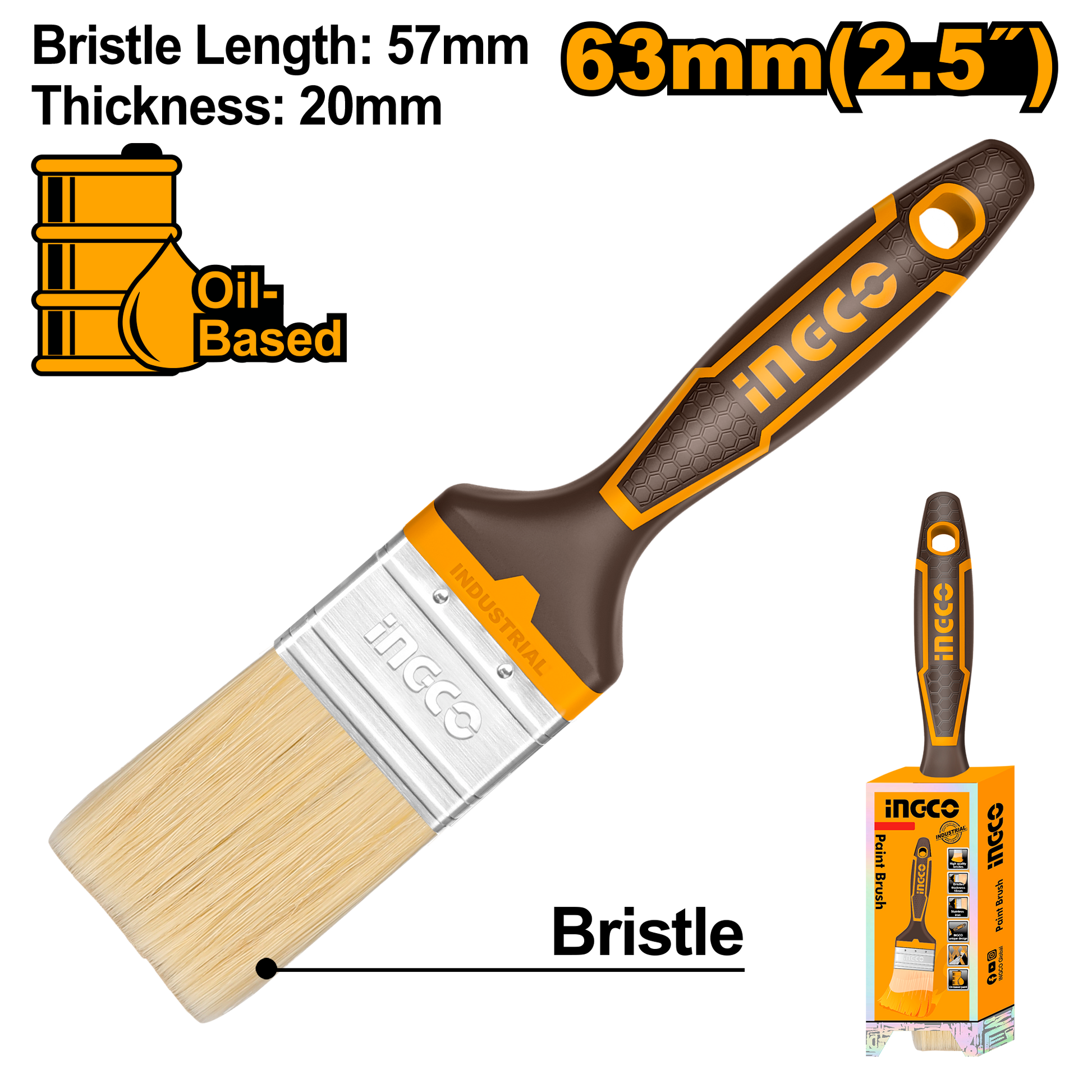 Width; 2.5" Bristle length: 57 mm Thickness: 20 mm For Oil-Based paint. High quality bristles. Unique design plastic handle. Packed by colour sleeve.