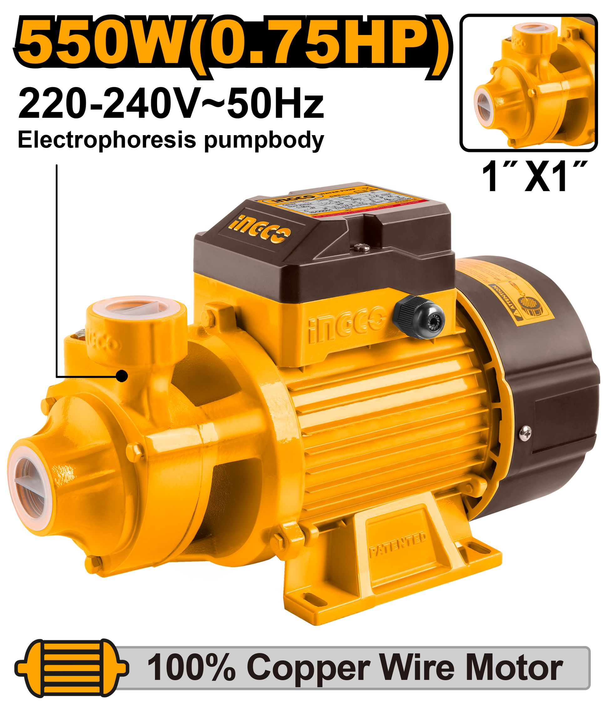 Voltage: 220-240 V~50 Hz Output power: 550 W (0.75 HP) Max. head: 45 m Max. flow: 45 L/min Max. suction: 8 m Pipe diameter: 1"x 1" Copper wire motor. Brass impeller. 0.15 m length cable. Peripheral Pump. Packed by carton box.