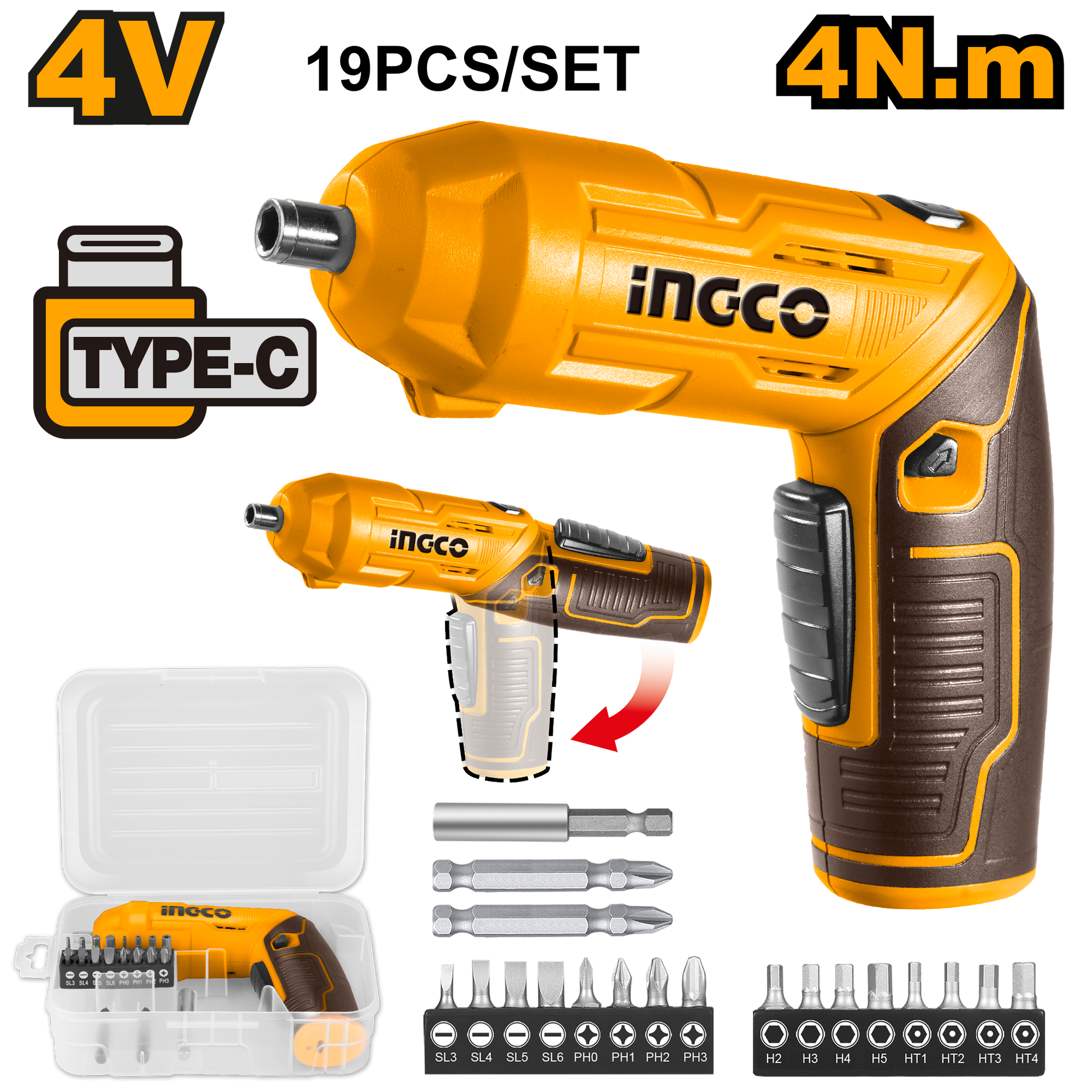 Voltage: 4V Hex shank: 1/4" No-load speed: 240 rpm Max torque: 4Nm Two positions adjustable handle Charging via USB type-C cable (cable sold separately)Integrated work light. Includes: 16 Pieces 25 mm Cr-V bits + holder 2 pieces 50 mm Cr-V bits + holder 1 Piece connector Packed by carrying case.