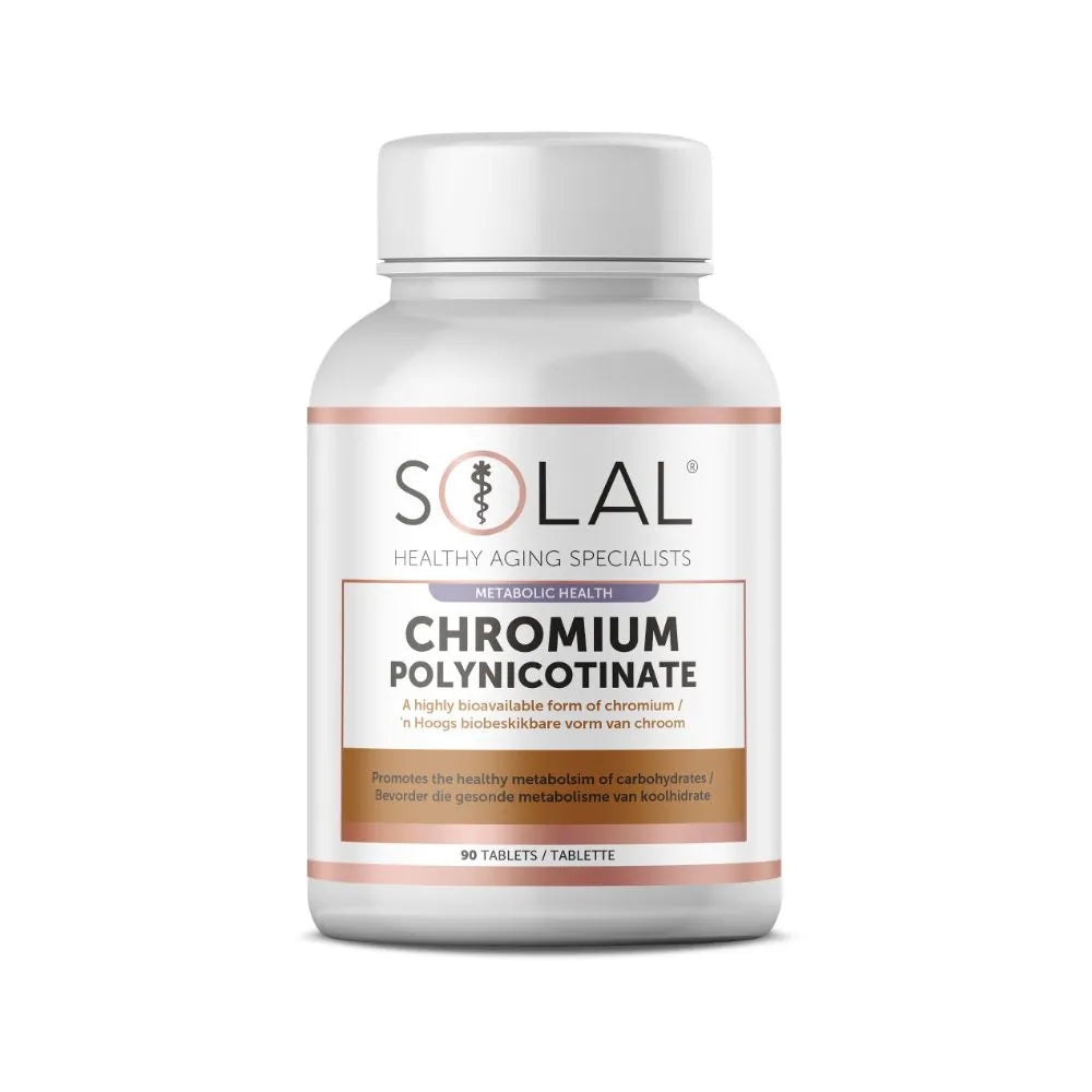 Chromium contributes to the maintenance of normal blood glucose levels and helps the body metabolise carbohydrates and fats.